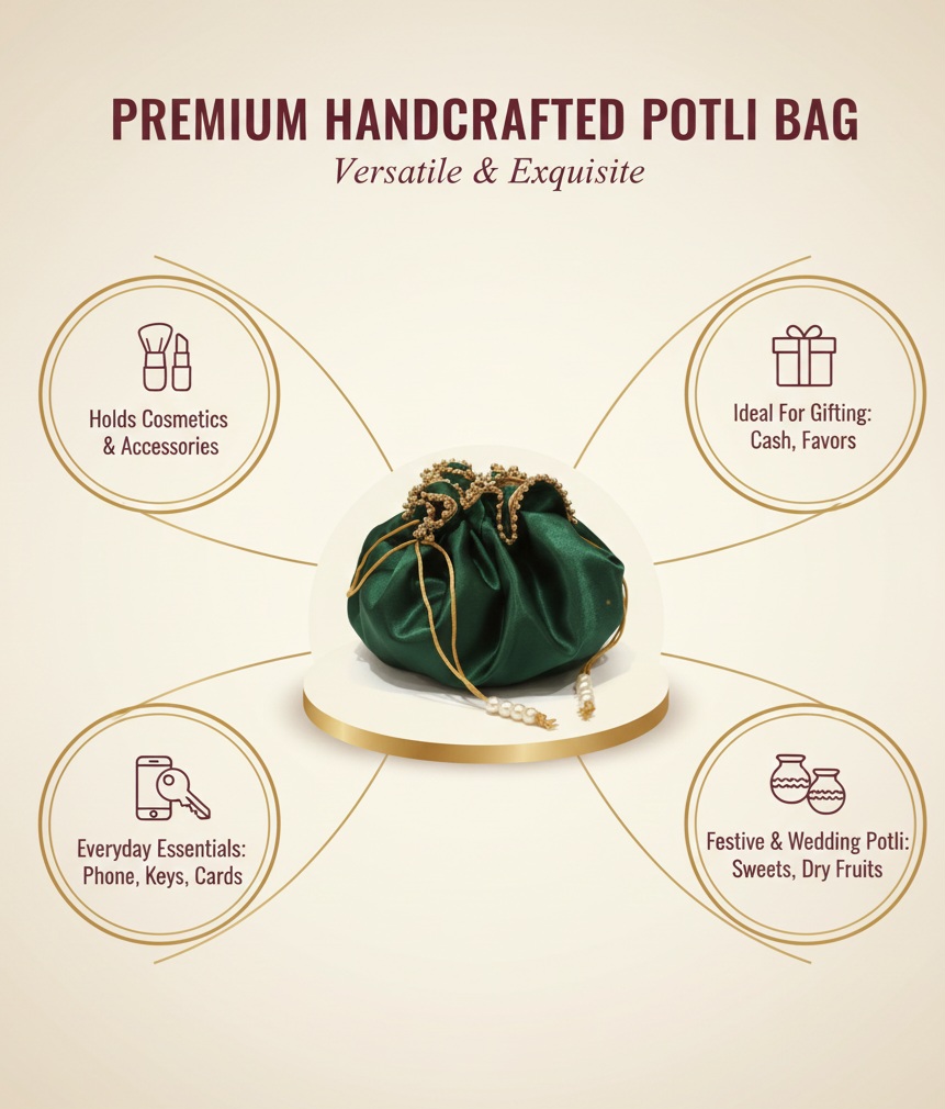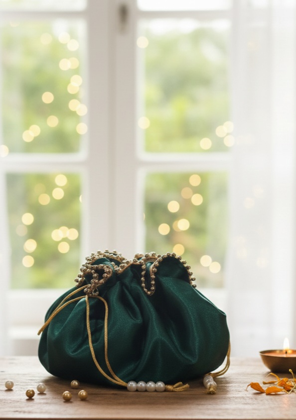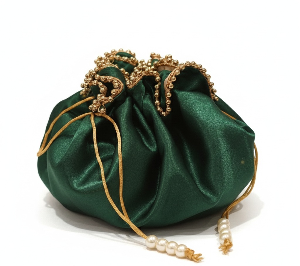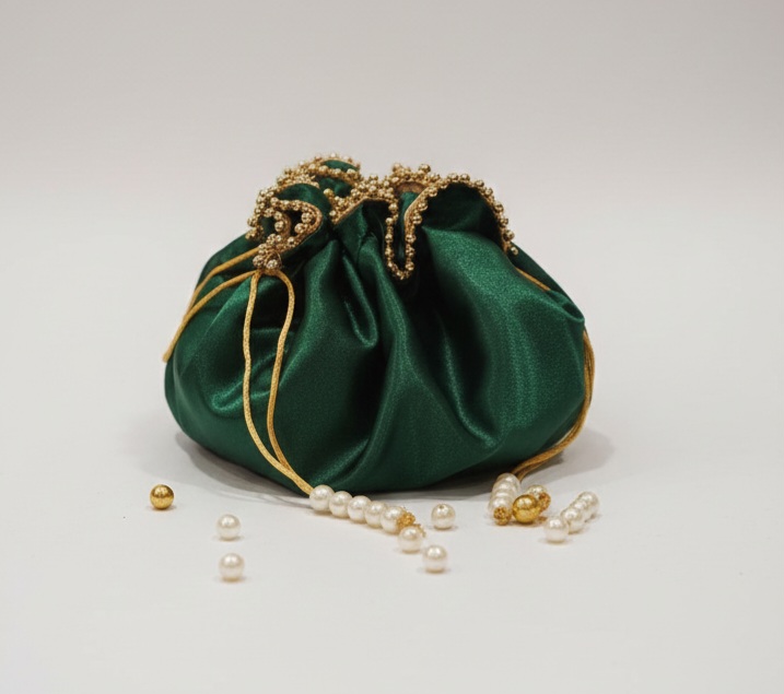 Elegant Silk Organza Potli Bag – Green Drawstring Pouch for Weddings & Jewelry