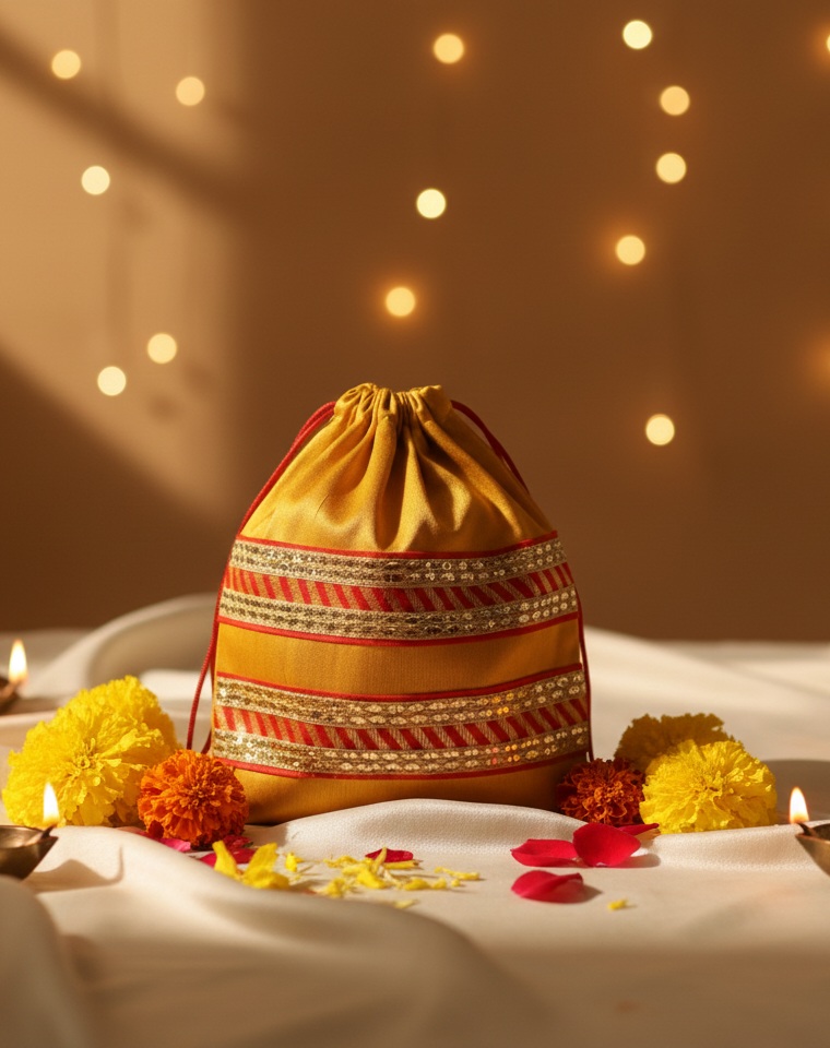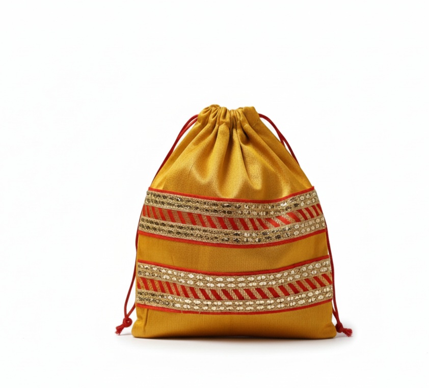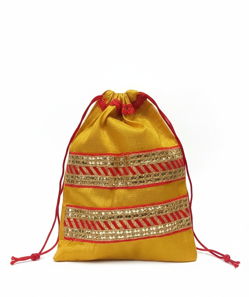 Add a touch of regal sophistication to your ensemble or gift-giving. This exquisite crimson Yellow potli bag is crafted from premium silk , featuring a voluminous “cloud” silhouette that safely cradles your most precious belongings.