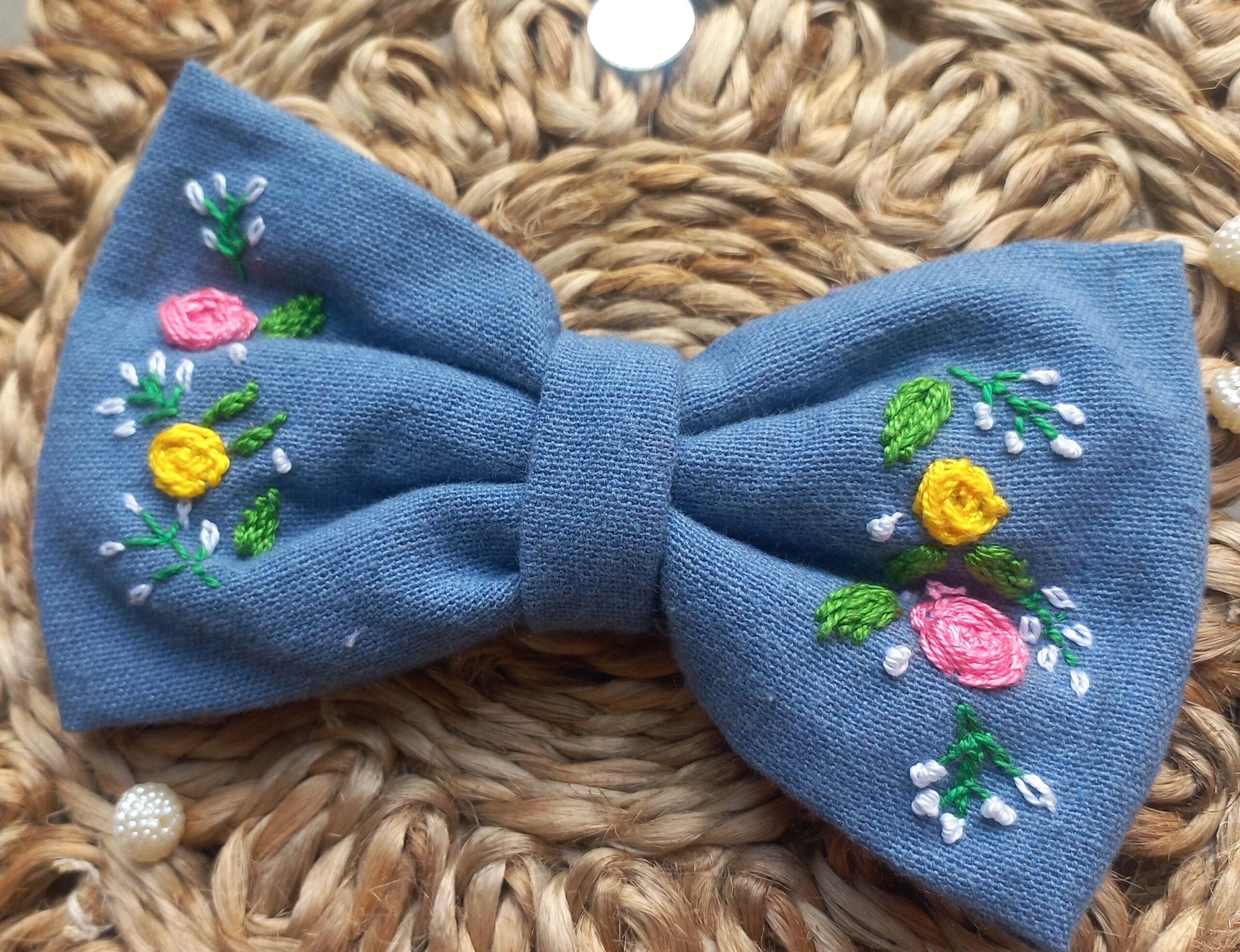 Add a touch of handcrafted artistry to your look with this beautiful dusty blue bow. Featuring delicate, hand-stitched floral embroidery in vibrant pink and sunny yellow, this piece captures a charming, meadow-inspired aesthetic. Made from a high-quality textured fabric, it provides a sturdy yet soft hold, making it an ideal statement piece for any hairstyle.