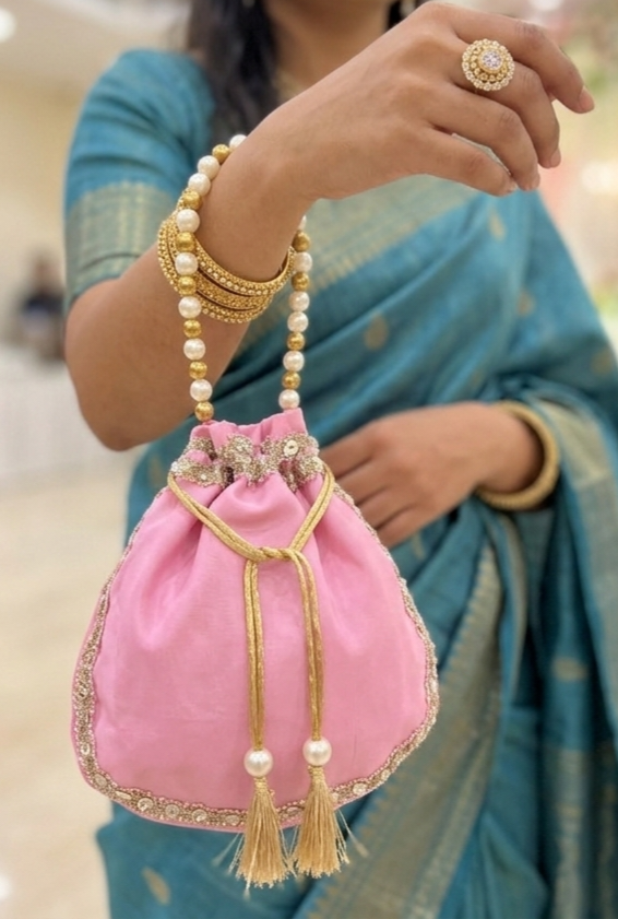 Each bag features a luxurious satin-silk finish, intricate Zari gold-work, and delicate sequin detailing. The highlight is the premium pearl-beaded handle, offering a comfortable wrist-carry that doubles as jewelry for your outfit.