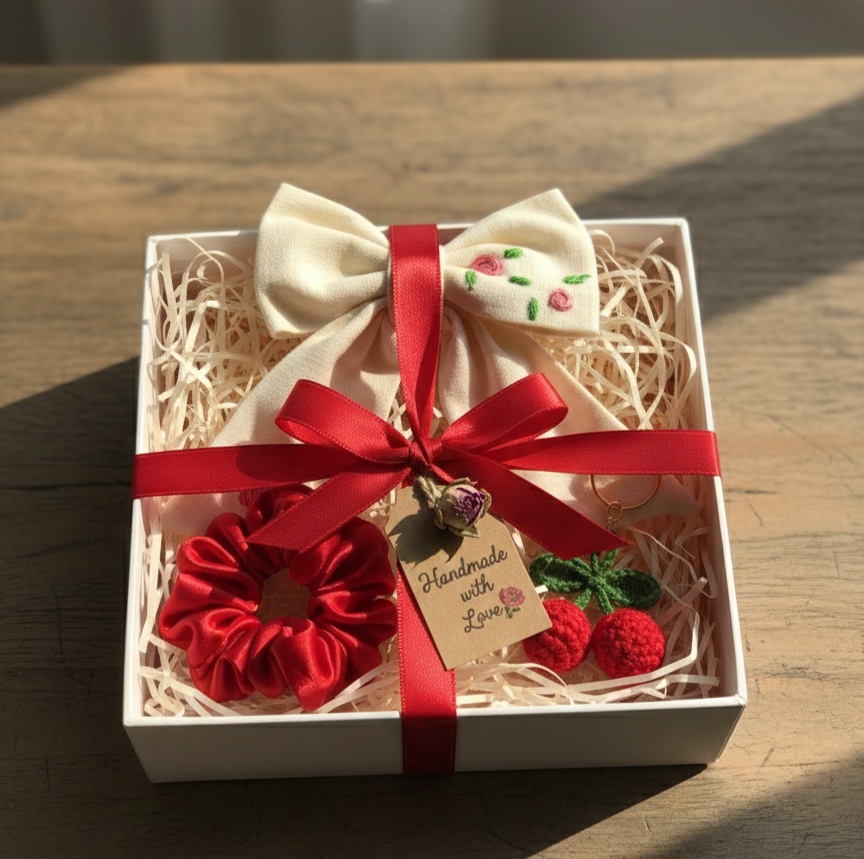 Handmade Cherry Accessory Set – Embroidered Floral Hair Bow, Red Satin Scrunchie, and Crochet Cherry Keychain