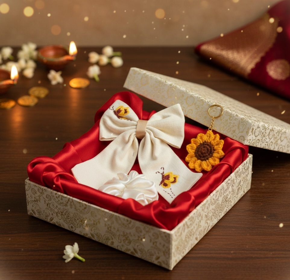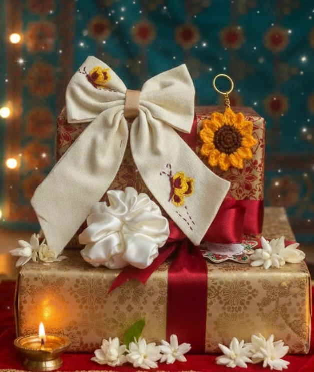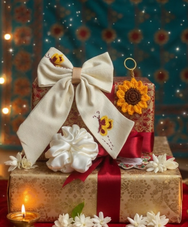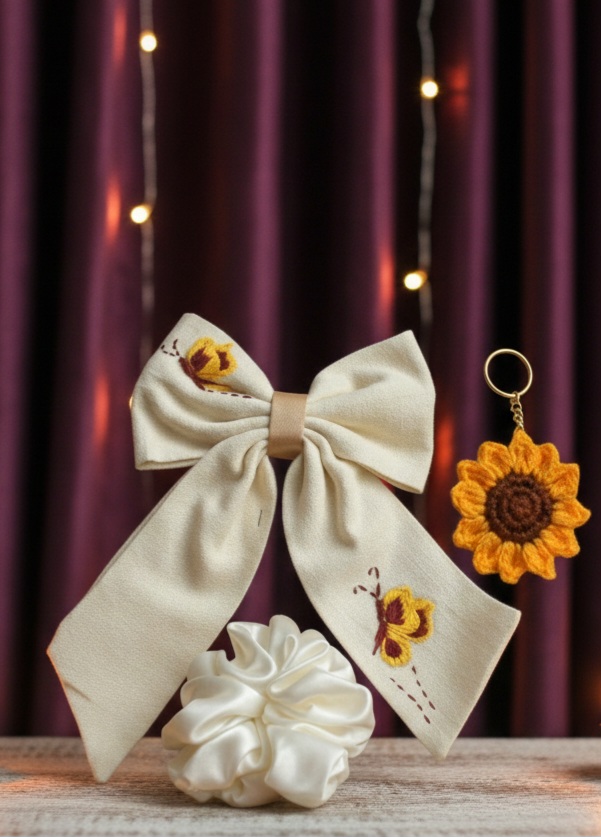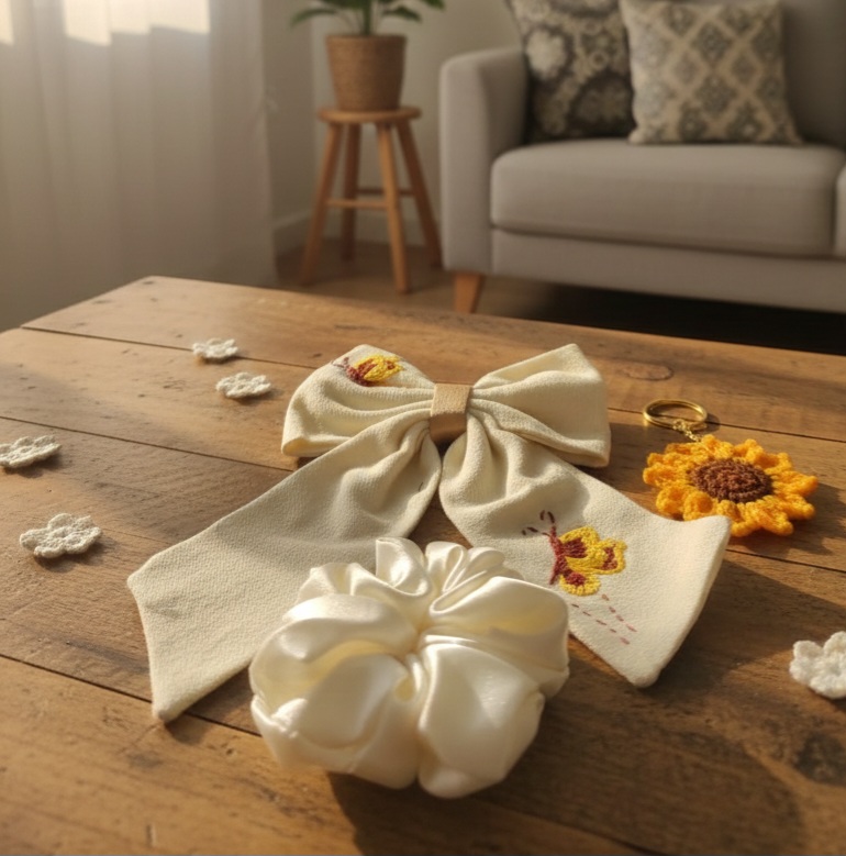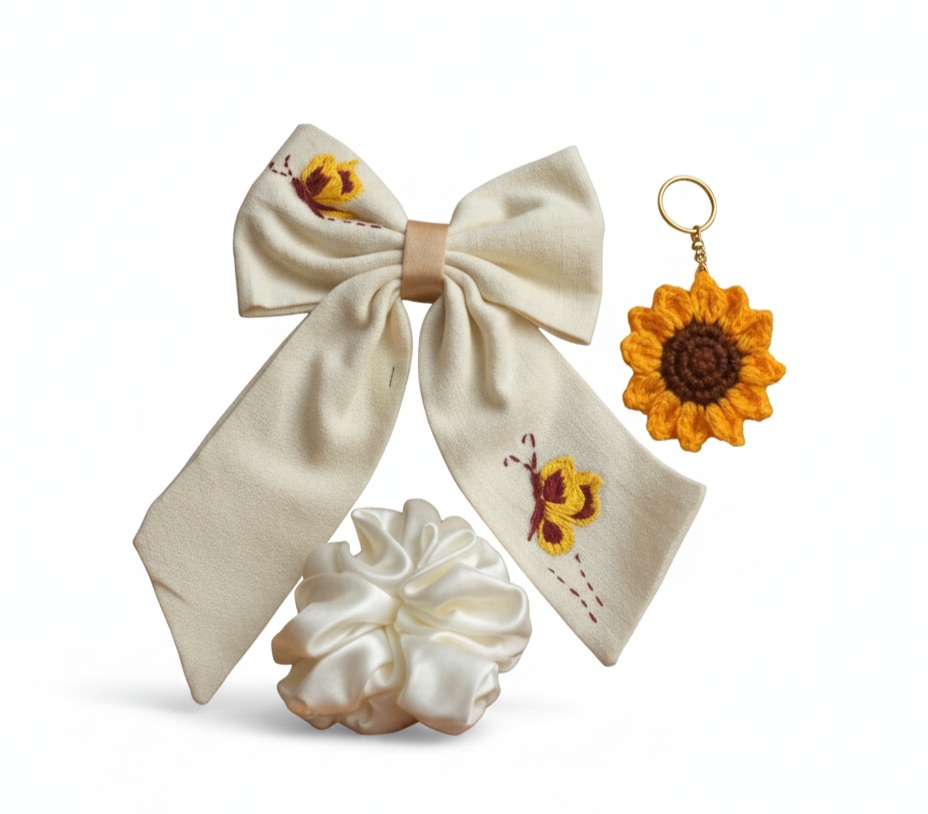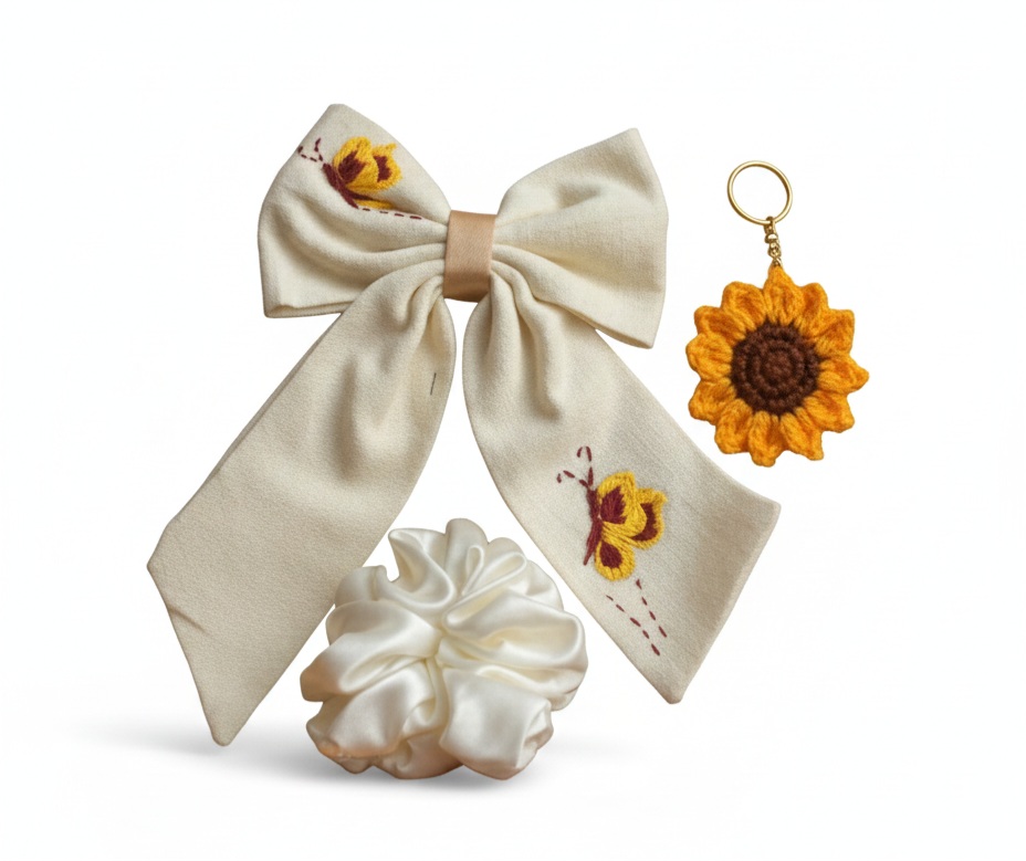Handmade Sunflower Accessory Set – Embroidered cotton Hair Bow, Satin Scrunchie, and Crochet Keychain