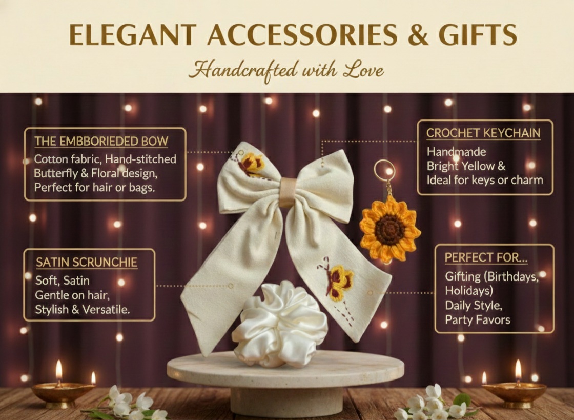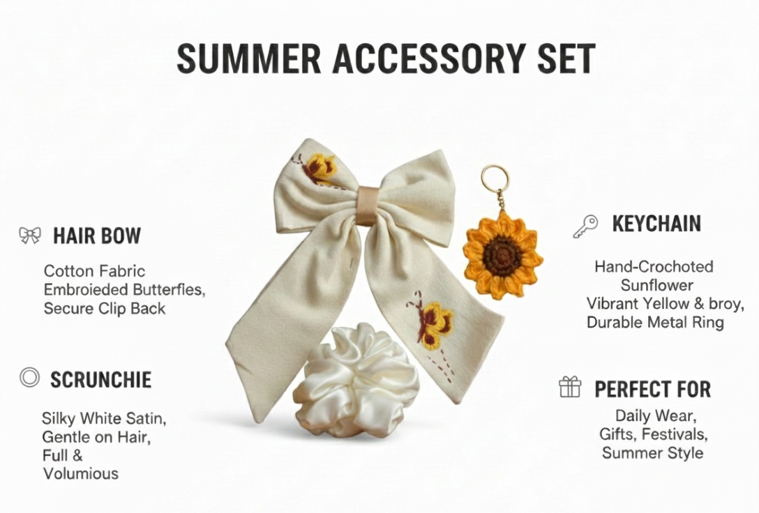 Bring a touch of sunshine to your daily style with our handcrafted Sunflower Accessory Bundle. This charming three-piece set is designed for those who love nature-inspired aesthetics and the unique quality of handmade goods. Whether you’re dressing up a ponytail or accessorizing your favorite bag, these pieces add a warm, cheerful glow to any outfit.