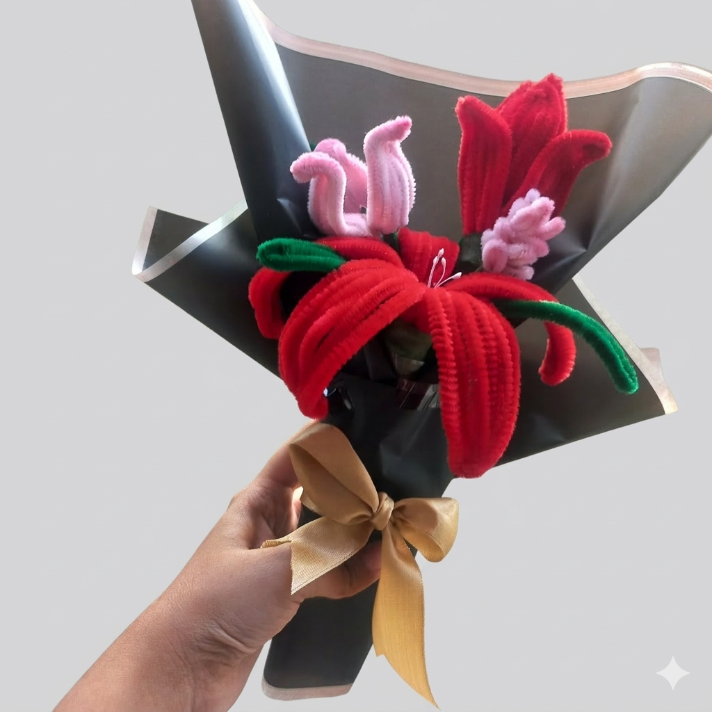 P&N Style Handcrafted Chenille Lily Bouquet – Romantic Red & Pink Forever Flowers