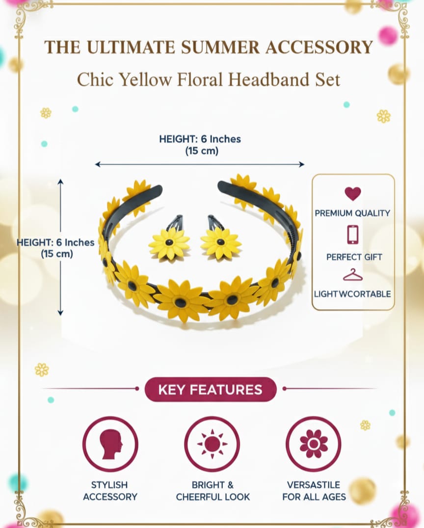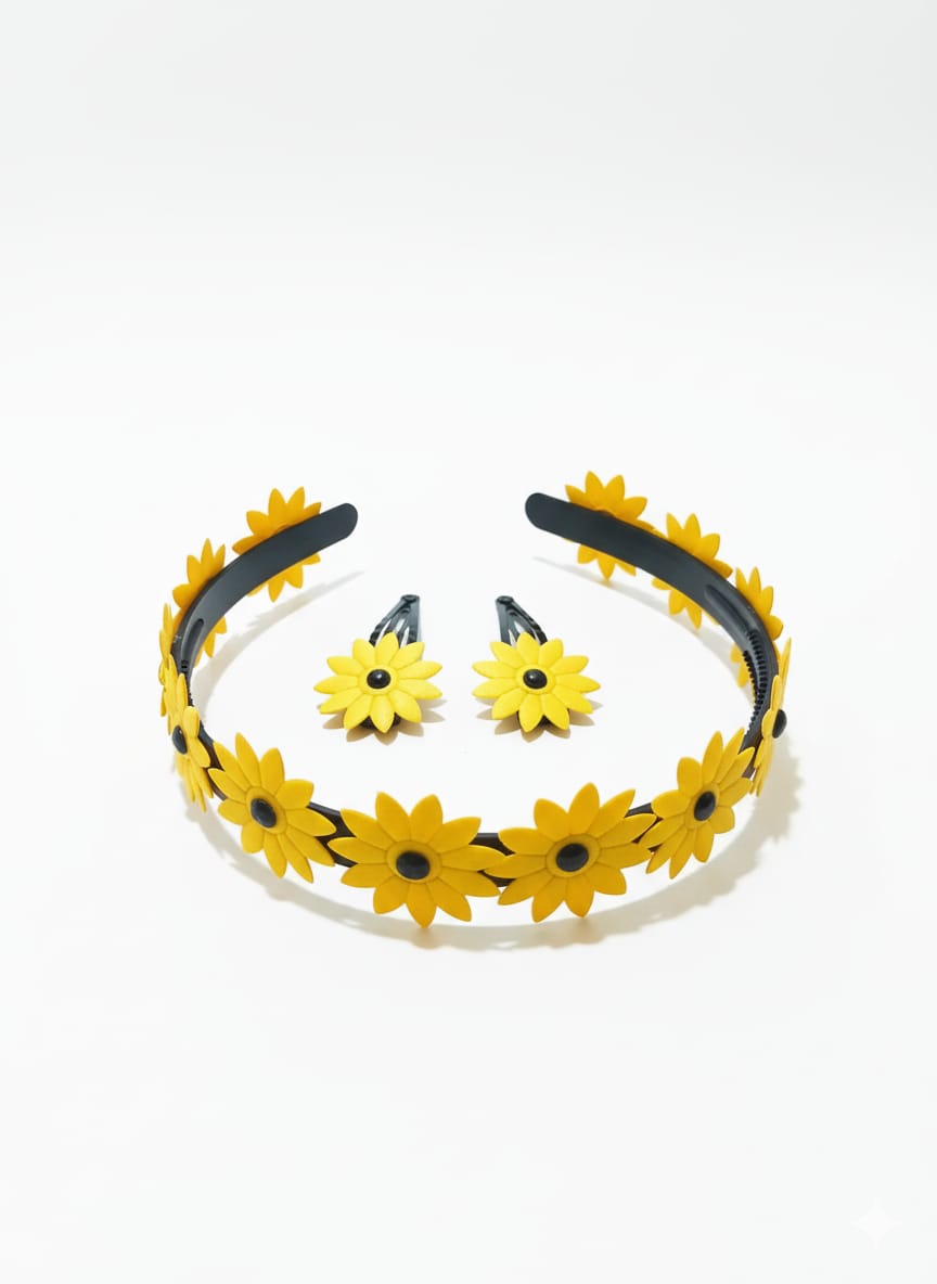 Elevate your everyday hairstyle with this vibrant sunflower-themed accessory set. Designed to bring a playful yet polished flair to your ensemble, this set includes one floral headband and two matching hair clips.